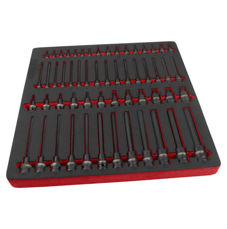 A comprehensive set of impact hex bit sockets in 1/4″, 3/8″ and 1/2″ drives. The set includes short and long versions of each.