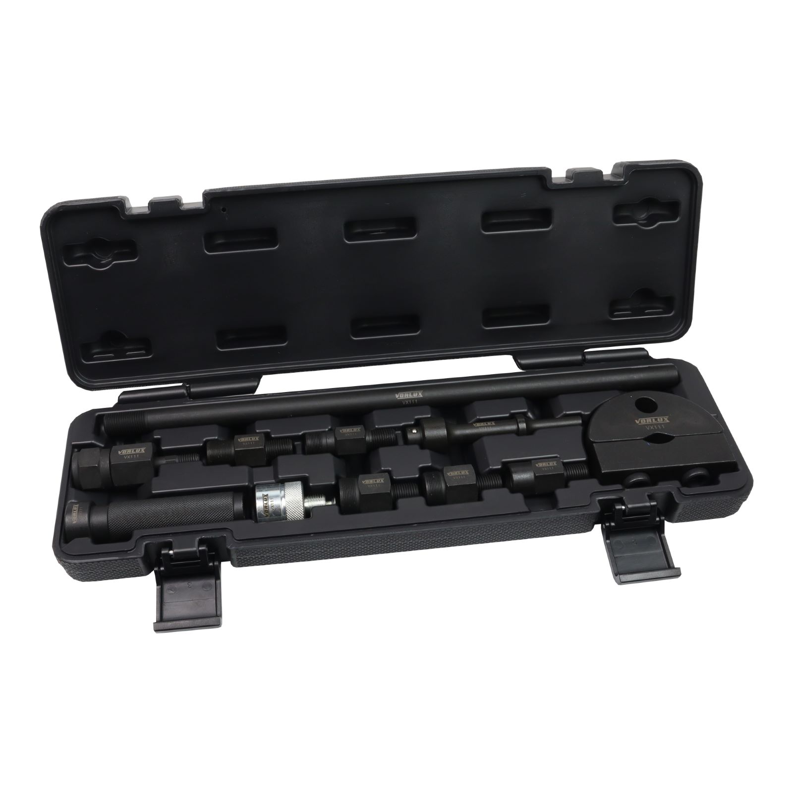 A professional quality diesel injector puller set with adaptors for the removal of seized injectors using impact force and vibration.